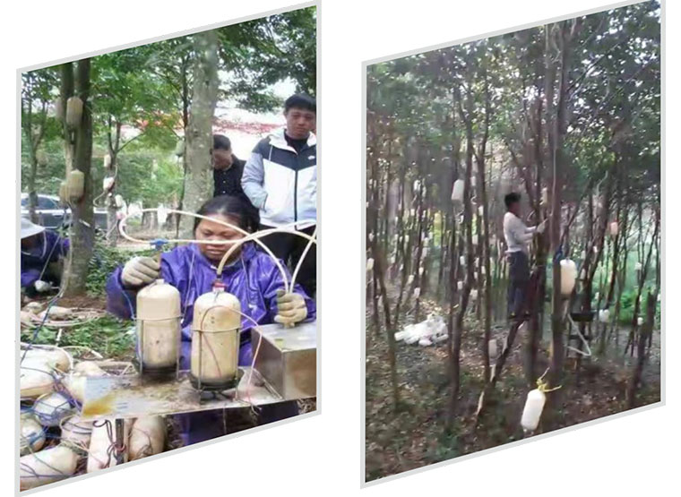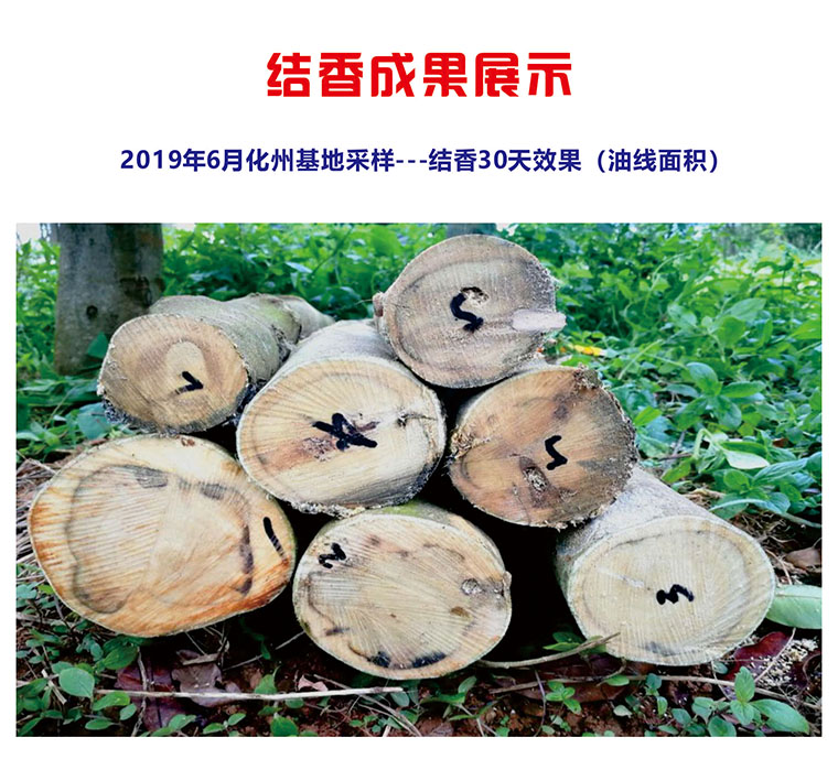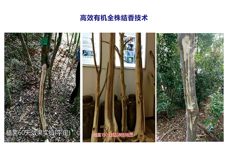 公司科研团队破译了沉香树结香的密码,优选公司菌种储备库的原菌母菌匹配,以食品级营养基,配合公司特有的纯植物酵母,以及国外顶级实验室引进的增益菌定向培育而成的“活化醣蛋白结香菌剂”,绝不含重金属及化学制剂,采用公司专属的 “气动式结香施工法”对沉香树进行人工干预结香,一经植入,即激活沉香树整体防御机制,突破性地营造野生沉香形成的条件和环境,有效抑制沉香树伤愈组织新生细胞的愈合并转化,从而充分促进和诱导白木香树泌脂结香,有机全株结香,效果显著并产出高品质沉香。