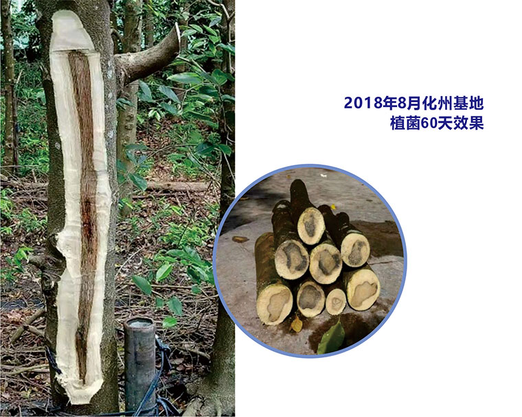 植菌一年即达到药用工业化生产沉香精油的原料标准,部分有效成分指标高于国家中药饮片质量标准,实际结香效果惊人,产成品有效成分惊人。